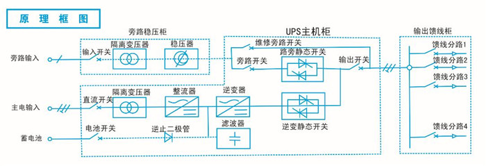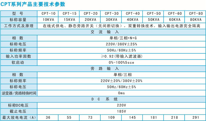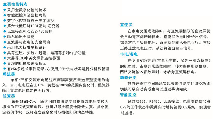 CPT型电力专用UPS由主机柜、旁路稳压柜、馈线柜组成,是针对中国电力的发展需求,专为发电厂、变电站、配电所设计的电源产品,具有双变换在线式、零转换功能,主要用于电力远动、DCS系统、电力载波、电力监控等。市电正常时,单相220V(或三相380V)经过隔离、整流滤波后通过逆变器提供定电源给负载供电;若交流电网输入异常或断电时,则由电力系统后备的直流屏经逆止二极管逆变供电。当直流屏欠压或断电时,静态开关切换到旁路供电;市电恢复正常时,自动切换到市电逆变供电。若逆变器过载或故障时,转为旁路供电,同时发出警告信号。广泛应用于发电厂、变电站、配电所等。