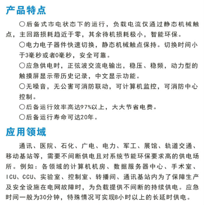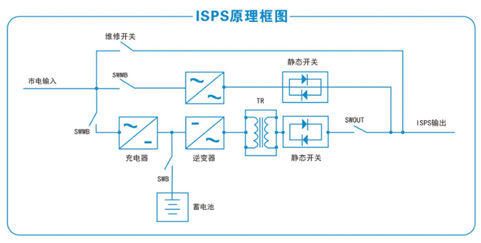 ISPS电源是一种节能环保智能型的不间断应急电源系统,该系统在传统的EPS应急电源基础上,采用电力电子静态开关切换、机械触点保持技术,实现零转换不间断供电。是目前应急供电领域最佳的解决方案。其节能、环保、不间断、寿命、安全等指标均远远高于在线式不间断电源系统。